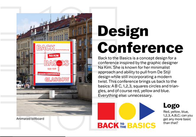 The title "Back to the Basics" references Kim's preference towards simplistic graphics and colors. The design pairs the minimalist graphic elements with complex typography, tulip fold brochure, and digital animations